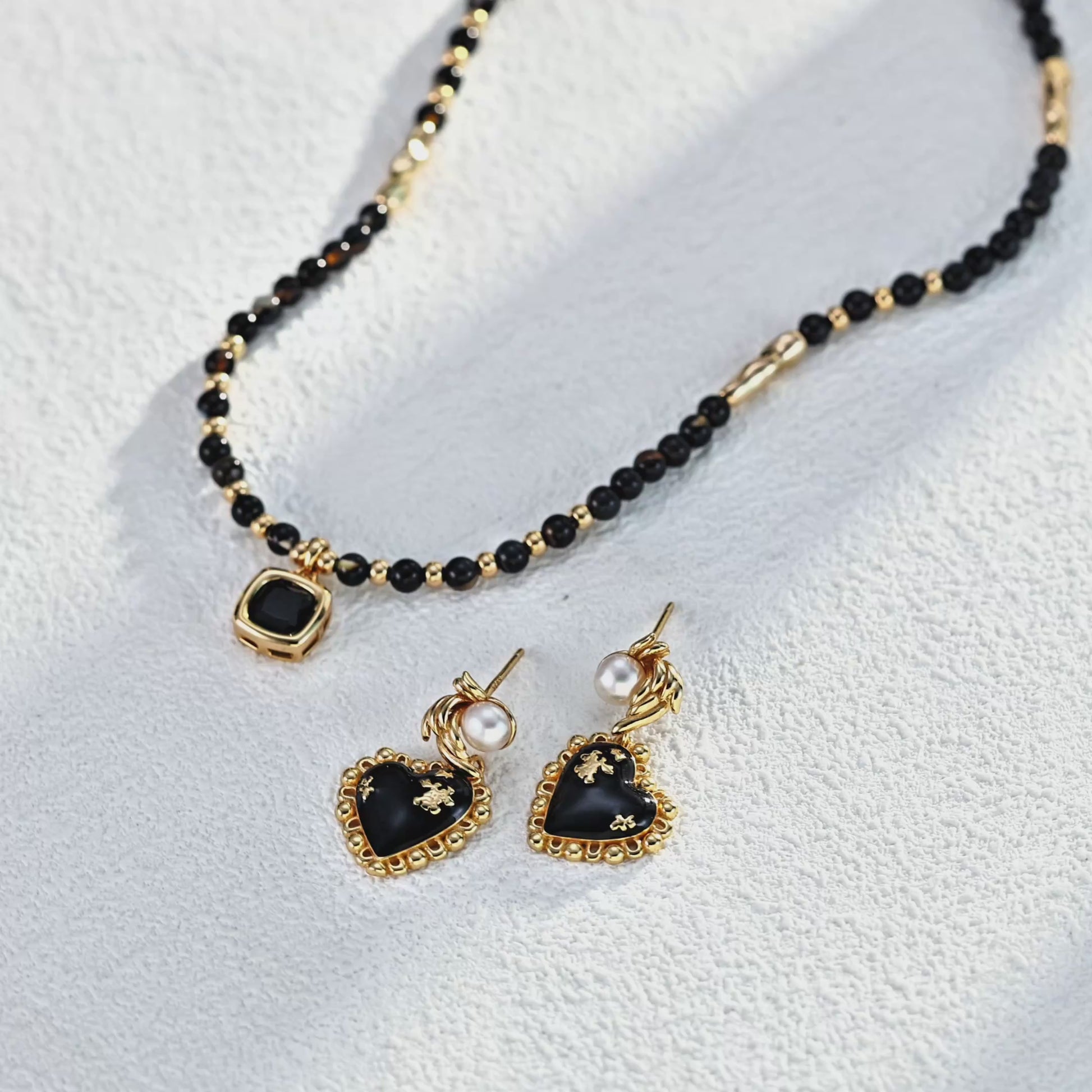 Romantic yet bold, these earrings combine the timeless elegance of pearls with the deep allure of black onyx. Crafted from S925 sterling silver with a retro gold finish, the design features a heart-shaped onyx detail accented by a luminous natural pearl. The refined contrast of light and dark creates a striking vintage-inspired piece that enhances both everyday and evening looks.