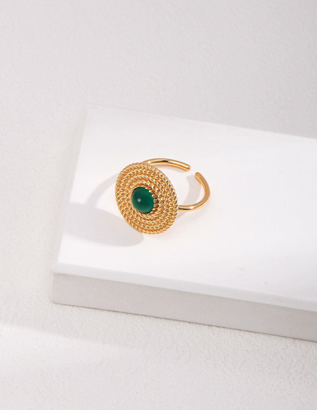 Crafted from 925 sterling silver plated with 18K vintage gold, this ring showcases a smooth natural chalcedony stone set in a bold, wide band design. The chalcedony’s soft glow contrasts beautifully with the warm vintage gold plating, creating a look that is both elegant and modern.